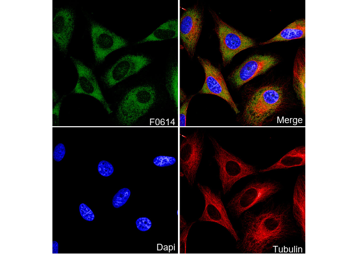 • Immunofluorescent analysis of Hela cells using F0614 (green, 1:200), Hoechst (blue) and tubulin (Red).