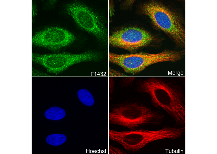 • Immunofluorescent analysis of Hela cells using F1432 (green, 1:100 ), Hoechst (blue) and tubulin (Red).