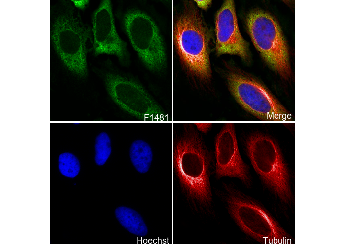 • Immunofluorescent analysis of Hela cells using F1481 (green, 1:200), Hoechst (blue) and tubulin (Red).