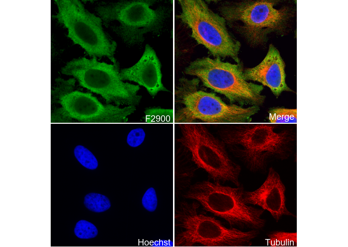 • Immunofluorescent analysis of Hela cells using F2900 (green, 1:500), Hoechst (blue) and tubulin (Red).