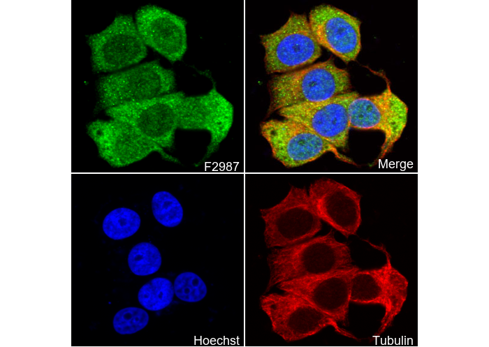 • Immunofluorescent analysis of HepG2 cells using F2987 (green, 1:100), Hoechst (blue) and tubulin (Red).