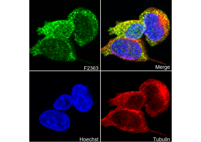 • Immunofluorescent analysis of MCF-7 cells using F2363 (green, 1:50), Hoechst (blue) and tubulin (Red).