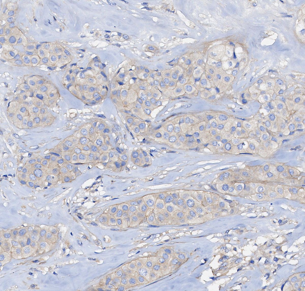 • Immunohistochemical analysis of formalin fixed paraffin embedded human breast cancer tissue with F0885 at 1/100 dilution.