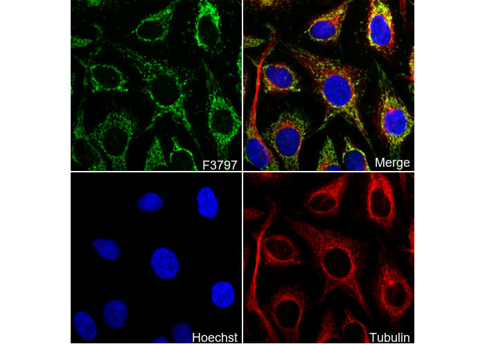 • Immunofluorescent analysis of Hela cells using F3797 (green, 1:100), Hoechst (blue) and tubulin (Red).