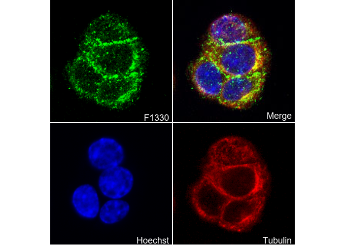 • Immunofluorescent analysis of HT-29 cells using F1330 (green, 1:800), Hoechst (blue) and tubulin (Red).