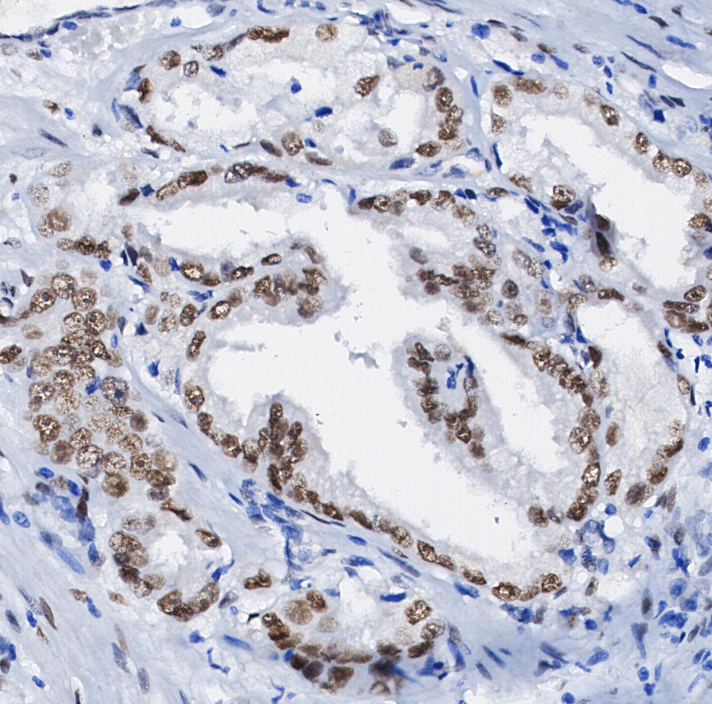 • Immunohistochemical analysis of formalin fixed paraffin embedded human prostate cancer tissue with F1083 at 1/100 dilution.