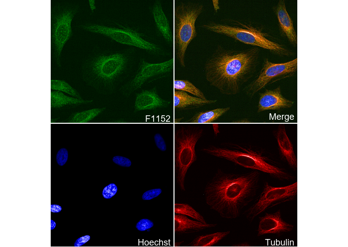 • Immunofluorescent analysis of Hela cells using F1152 (green, 1:400), Hoechst (blue) and tubulin (Red).