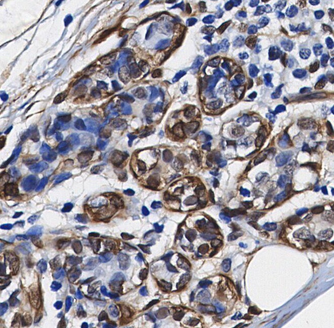 • Immunohistochemical analysis of formalin fixed paraffin embedded human Breast Cancer tissue with F1152 at 1/100 dilution.