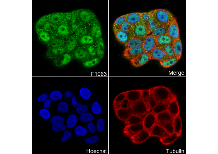 • Immunofluorescent analysis of T-47D cells using F1063 (green, 0.0763888888888889), Hoechst (blue) and tubulin (Red).