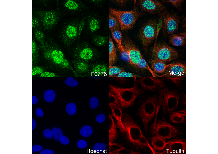 • Immunofluorescent analysis of A549 cells using F0778 (green, 1:3200), Hoechst (blue) and tubulin (Red).