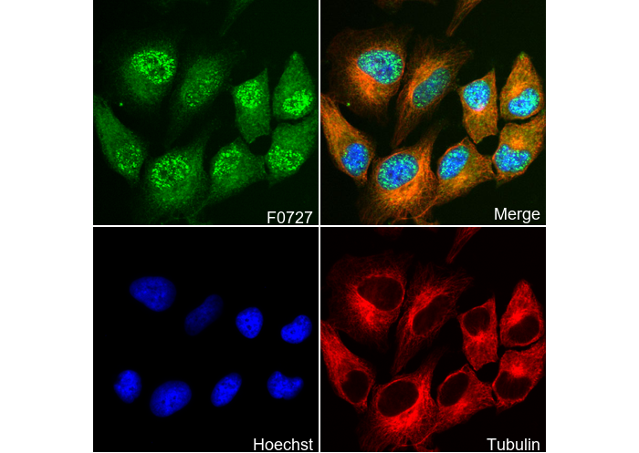 • Immunofluorescent analysis of SK-OV-3 cells using F0727 (green, 1:1000), Hoechst (blue) and tubulin (Red).