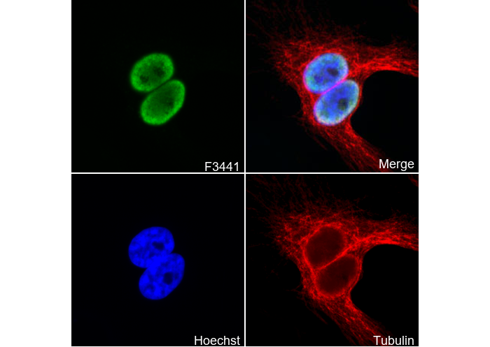 • Immunofluorescent analysis of Hela cells using F3441 (green, 1:500), Hoechst (blue) and tubulin (Red).