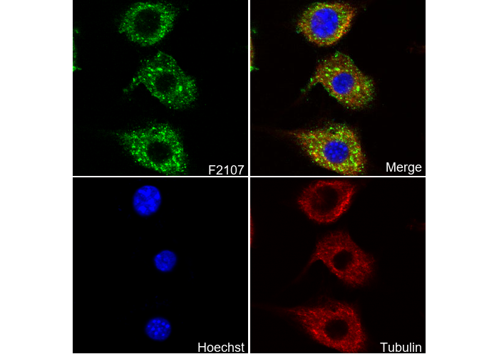 • Immunofluorescent analysis of PC-12 cells using F2107 (green, 1:200), Hoechst (blue) and tubulin (Red).