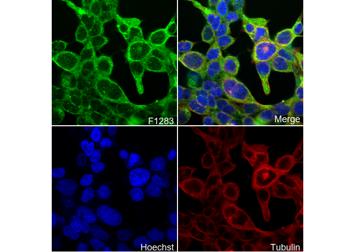• Immunofluorescent analysis of U251 cells using F1283 (green, 1:2000), Hoechst (blue) and tubulin (Red).