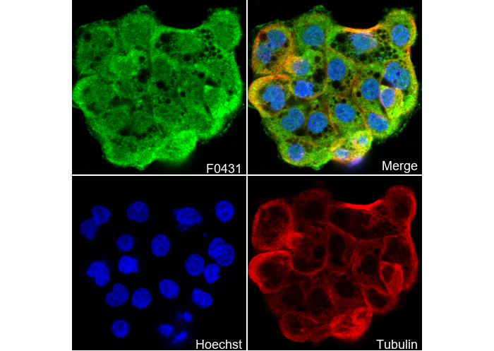 • Immunofluorescent analysis of NTERA-2 cells using F0431 (green, 1:50), Hoechst (blue) and tubulin (Red).