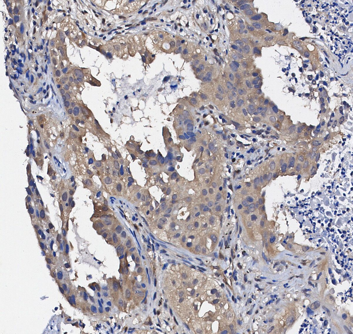 • Immunohistochemical analysis of formalin fixed paraffin embedded human Lung adenocarcinoma tissue with F0431 at 1/50 dilution.