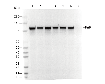 • Lane 1: OVCAR3 , Lane 2: A431 , Lane 3: HT29 , Lane 4: SK-OV-3 , Lane 5: WT38 , Lane 6: 293 , Lane 7: 293 (koFAK)