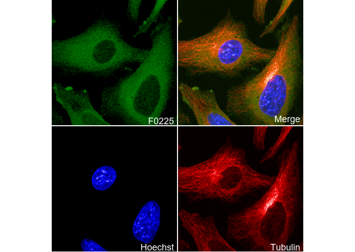 • Immunofluorescent analysis of Hela cells using F0225 (green, 1:50), Hoechst (blue) and tubulin (Red).