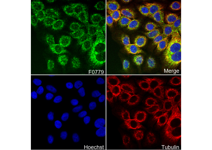 • Immunofluorescent analysis of HACAT cells using F0779 (green, 1:200), Hoechst (blue) and tubulin (Red).
