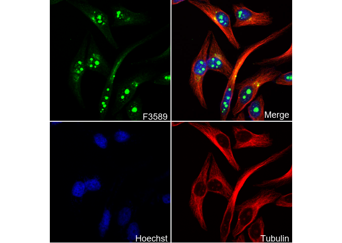 • Immunofluorescent analysis of Hela cells using F3589 (green, 1:5000), Hoechst (blue) and tubulin (Red).