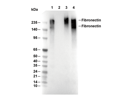 • Lane 1: MCF7, Lane 2: MCF7 (KO Human FN1), Lane 3: HepG2, Lane 4: PC-3