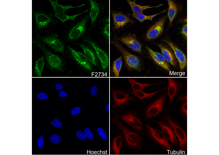 • Immunofluorescent analysis of Hela cells using F2734 (green, 1:200), Hoechst (blue) and tubulin (Red).