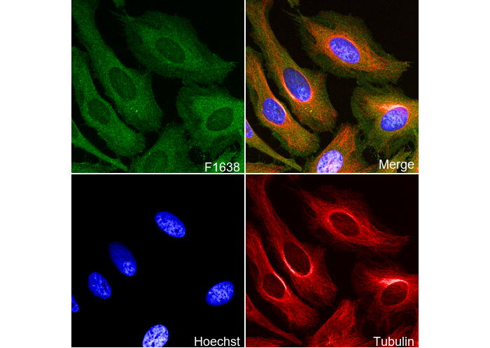 • Immunofluorescent analysis of Hela cells using F1638 (green, 1:100), Hoechst (blue) and tubulin (Red).