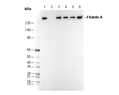 • Lane 1: HAP1 , Lane 2: HAP1 (KO FLNA) , Lane 3: COS-1 , Lane 4: Hela , Lane 5: 3T3 , Lane 6: C6