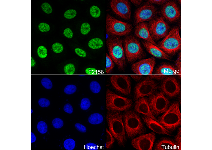 • Immunofluorescent analysis of HepG2 cells using F2156 (green, 1:100), Hoechst (blue) and tubulin (Red).