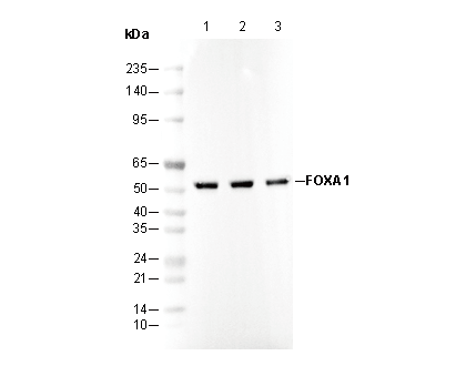 FOXA1 Antibody [E4N8] recognizes endogenous levels of total FOXA1 protein.