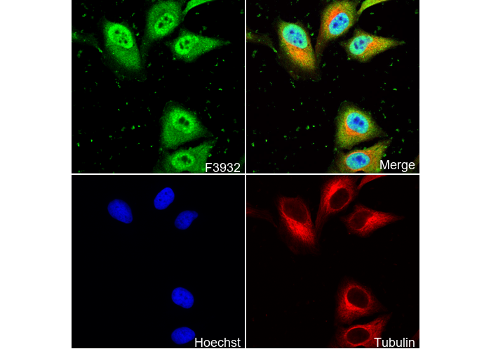 • Immunofluorescent analysis of Hela cells using F3932 (green, 1:400), Hoechst (blue) and tubulin (Red).