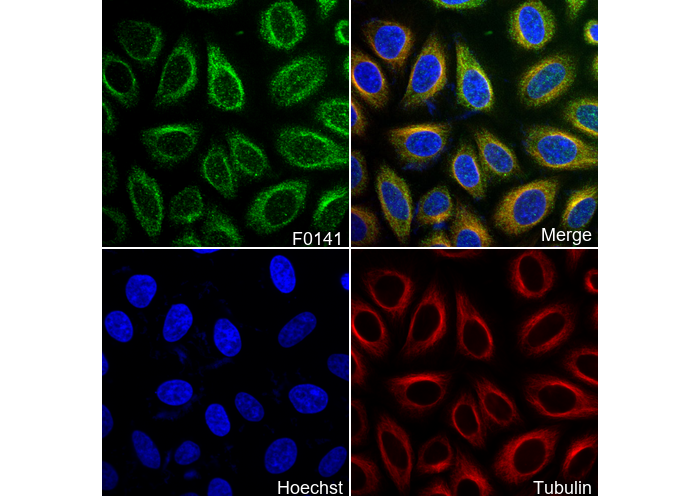• Immunofluorescent analysis of HepG2 cells using F0141 (green, 1:50), Hoechst (blue) and tubulin (Red).