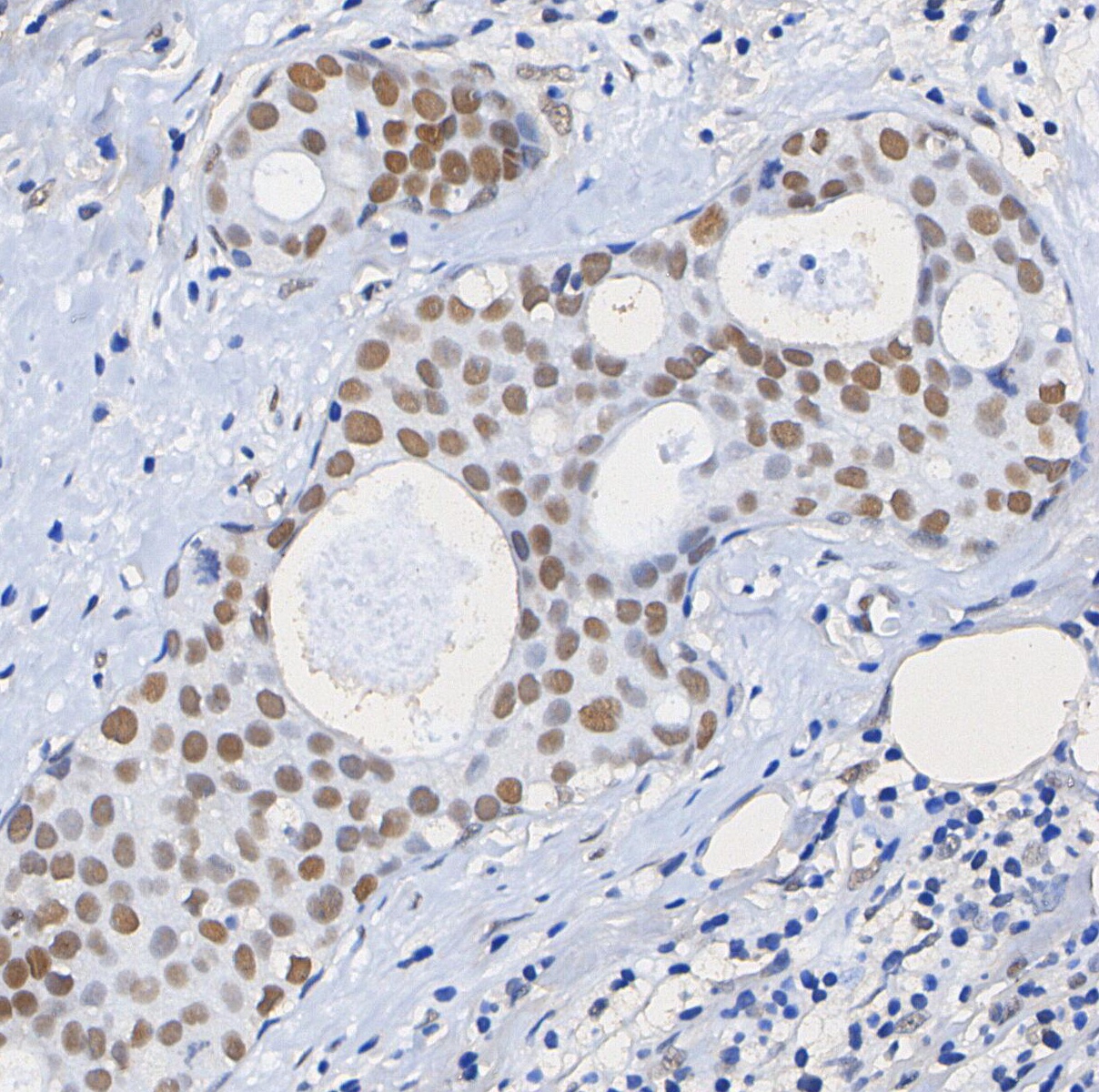 • Immunohistochemical analysis of formalin fixed paraffin embedded human Breast cancer tissue with F1284 at 1/100 dilution.