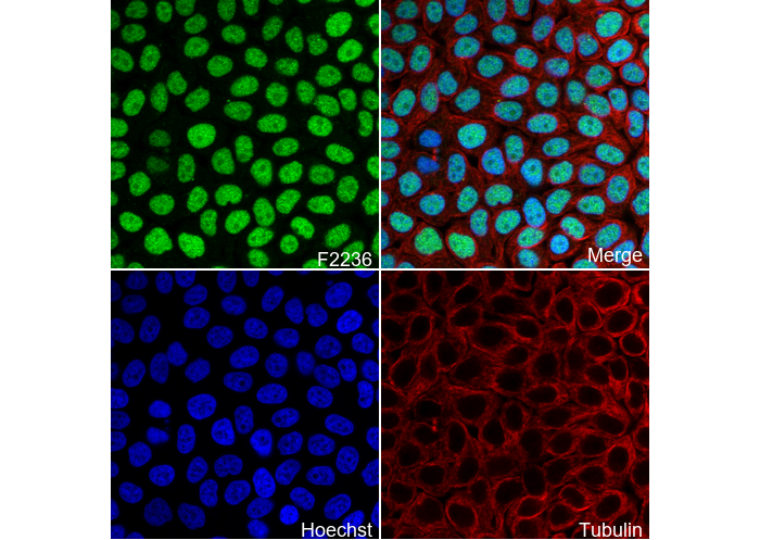 • Immunofluorescent analysis of BxPC-3 cells using F2236 (green, 1:250), Hoechst (blue) and tubulin (Red).