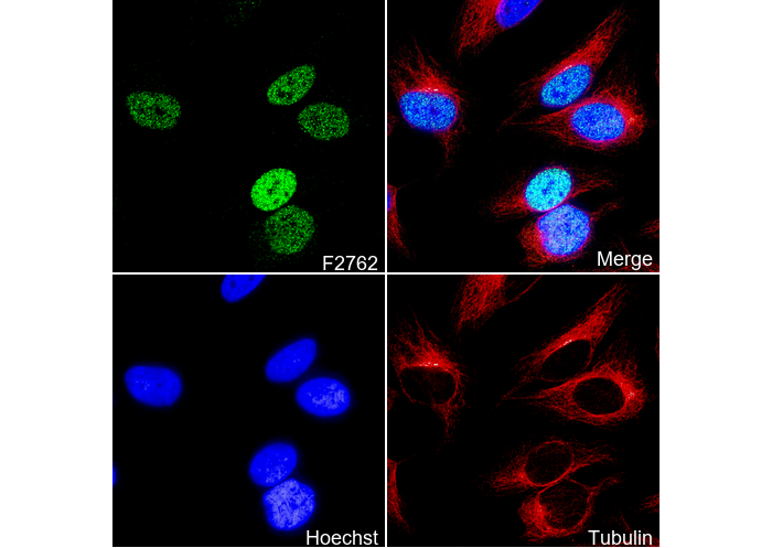 • Immunofluorescent analysis of Hela cells using F2762 (green, 1:500), Hoechst (blue) and tubulin (Red).