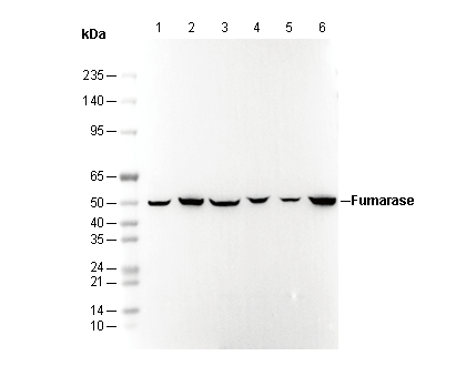 Fumarase Antibody [E1P13] recognizes endogenous levels of total fumarase protein.
