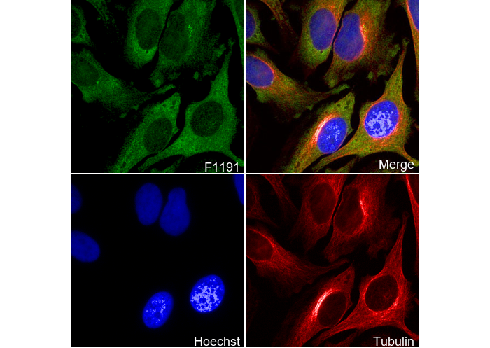 • Immunofluorescent analysis of Hela cells using F1191 (green, 1:250), Hoechst (blue) and tubulin (Red).