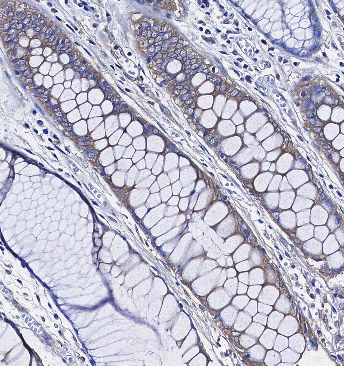 • Immunohistochemical analysis of formalin fixed paraffin embedded human Colorectal cancer tissue with F1191 at 1/100 dilution.