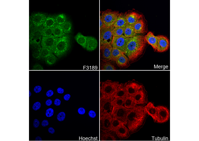 • Immunofluorescent analysis of BxPC-3 cells using F3189 (green, 1:500), Hoechst (blue) and tubulin (Red).