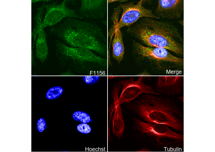• Immunofluorescent analysis of Hela cells using F1156 (green, 1:100), Hoechst (blue) and tubulin (Red).