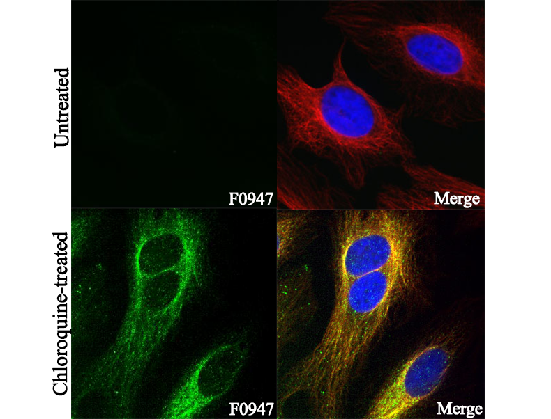 • Immunofluorescent analysis of Hela cells, untreated (upper) and chloroquine-treated(50 µM, 24h)(lower), using F0947 (green, 1:200), Hoechst (blue) and tubulin (Red).