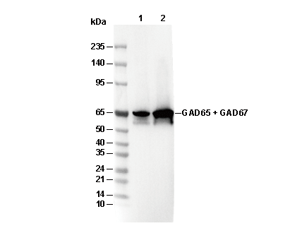 GAD65 + GAD67 Antibody [E3F11] recognizes endogenous levels of total GAD65 + GAD67 protein.