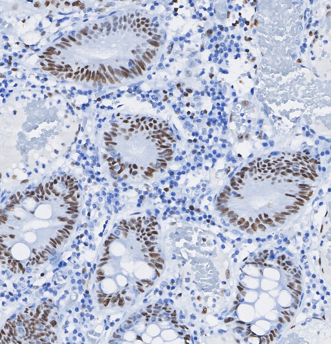 • Immunohistochemical analysis of formalin fixed paraffin embedded human Colorectal cancer tissue with F0074 at 1/200 dilution.
