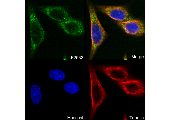 • Immunofluorescent analysis of PC-12 cells using F2532 (green, 1:1000), Hoechst (blue) and tubulin (Red).