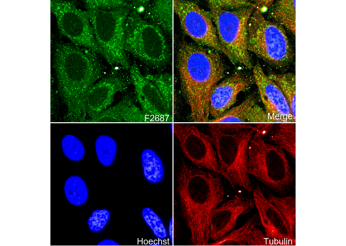 • Immunofluorescent analysis of Hela cells using F2687 (green, 1:500), Hoechst (blue) and tubulin (Red).