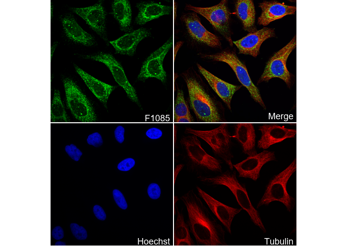 • Immunofluorescent analysis of Hela cells using F1085 (green, 1:160), Hoechst (blue) and tubulin (Red).
