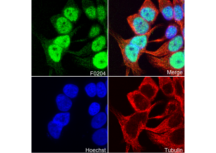 • Immunofluorescent analysis of MCF-7 cells using F0204 (green, 1:200), Hoechst (blue) and tubulin (Red).