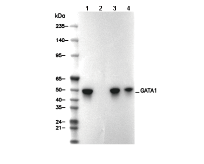 • Lane 1: K562, Lane 2: K562 (KO GATA1), Lane 3: HEL, Lane 4: MOLT-4