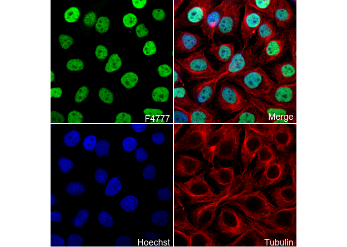 • Immunofluorescent analysis of Huh7 cells using F4777 (green, 1:50), Hoechst (blue) and tubulin (Red).