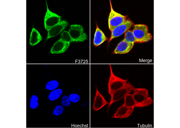 • Immunofluorescent analysis of MCF-7 cells using F3725 (green, 1:250), Hoechst (blue) and tubulin (Red).